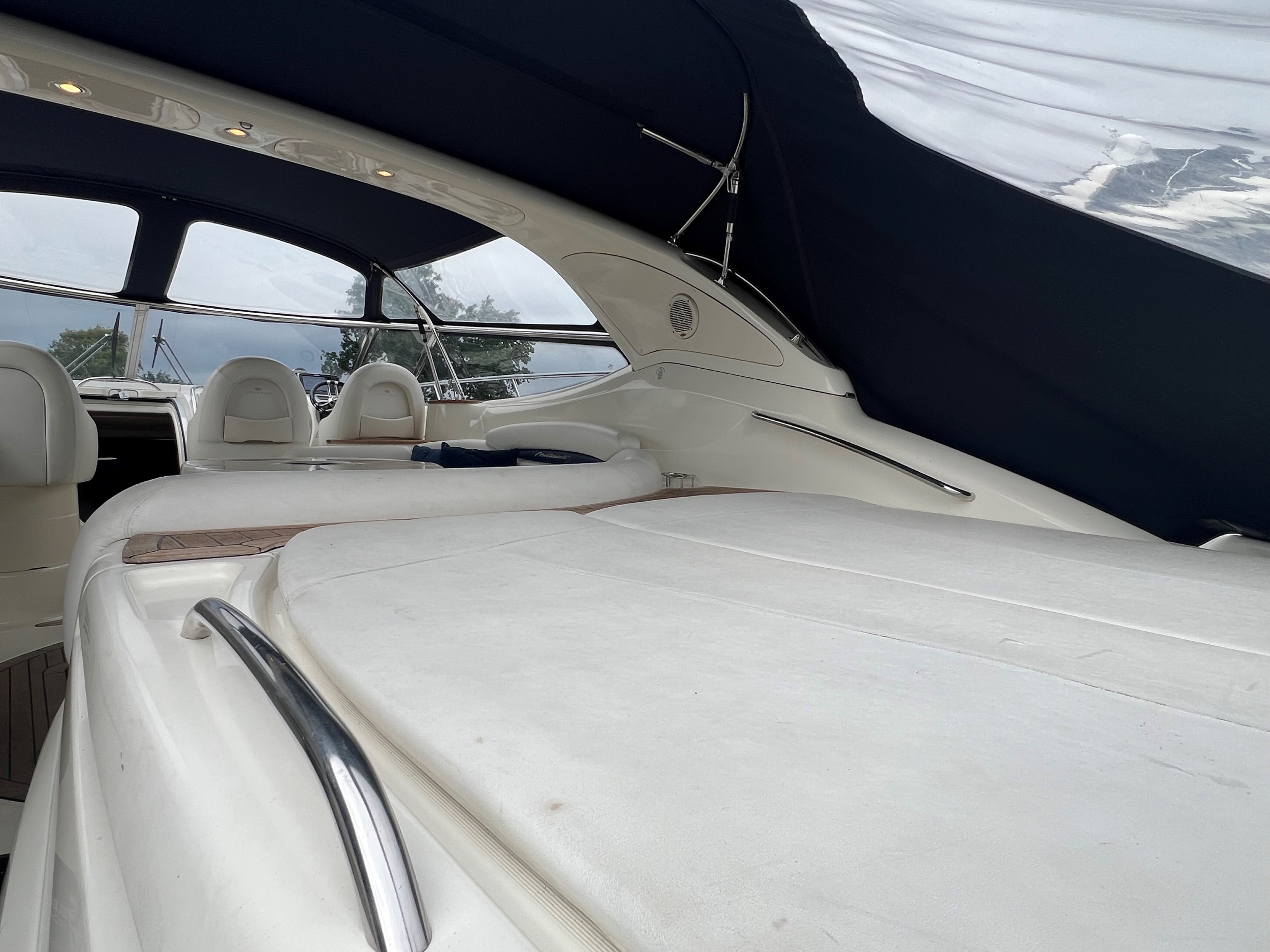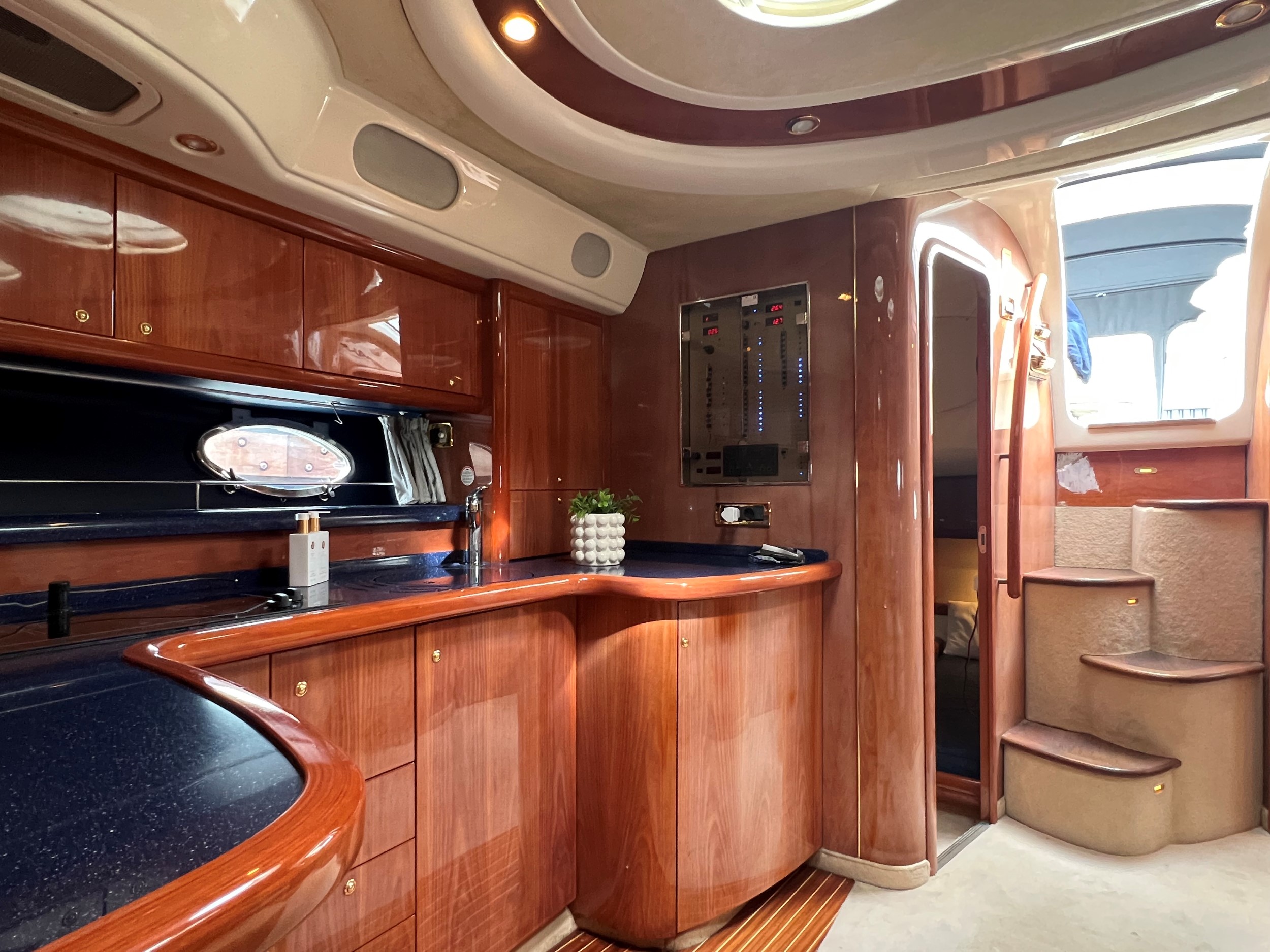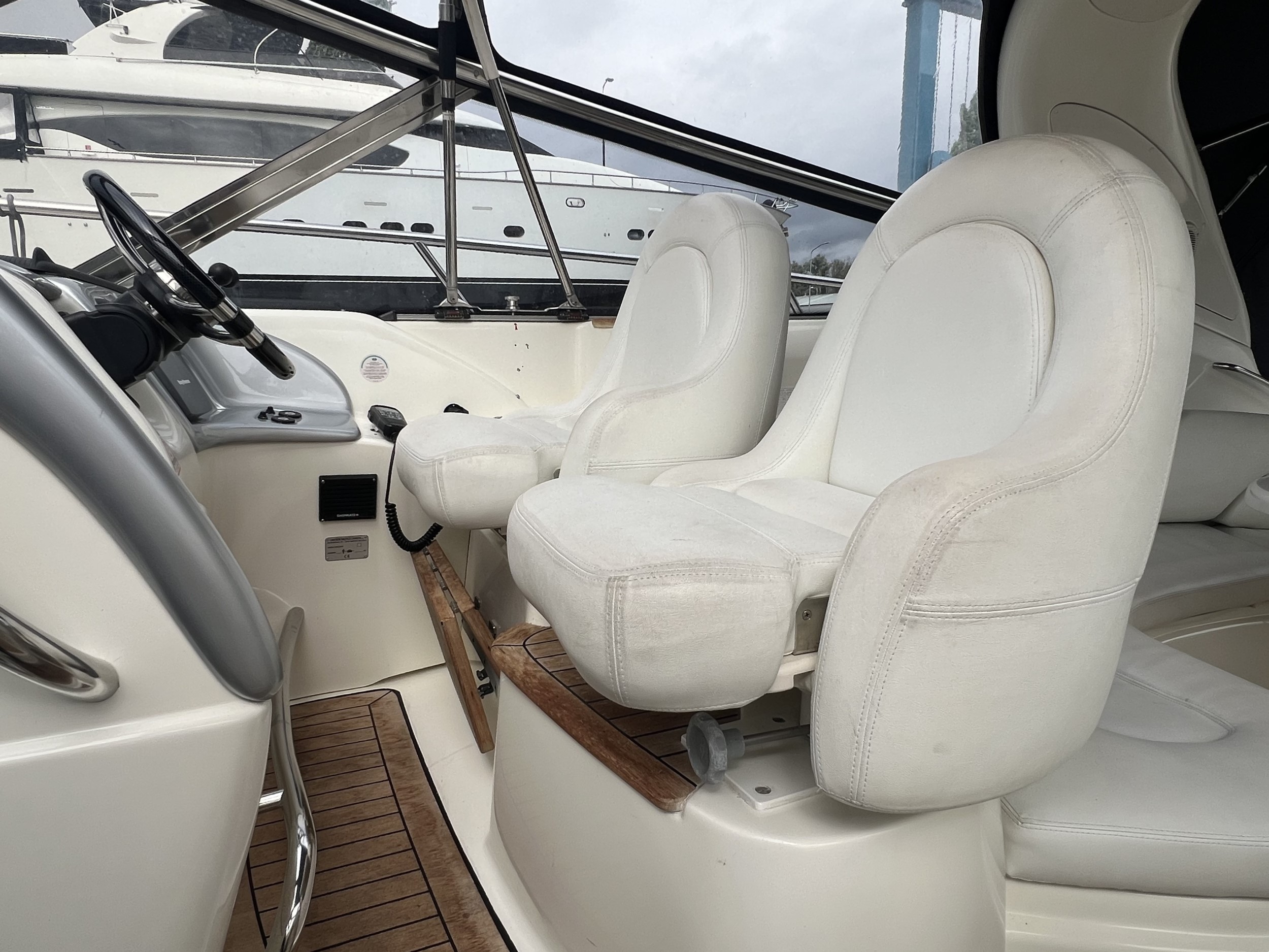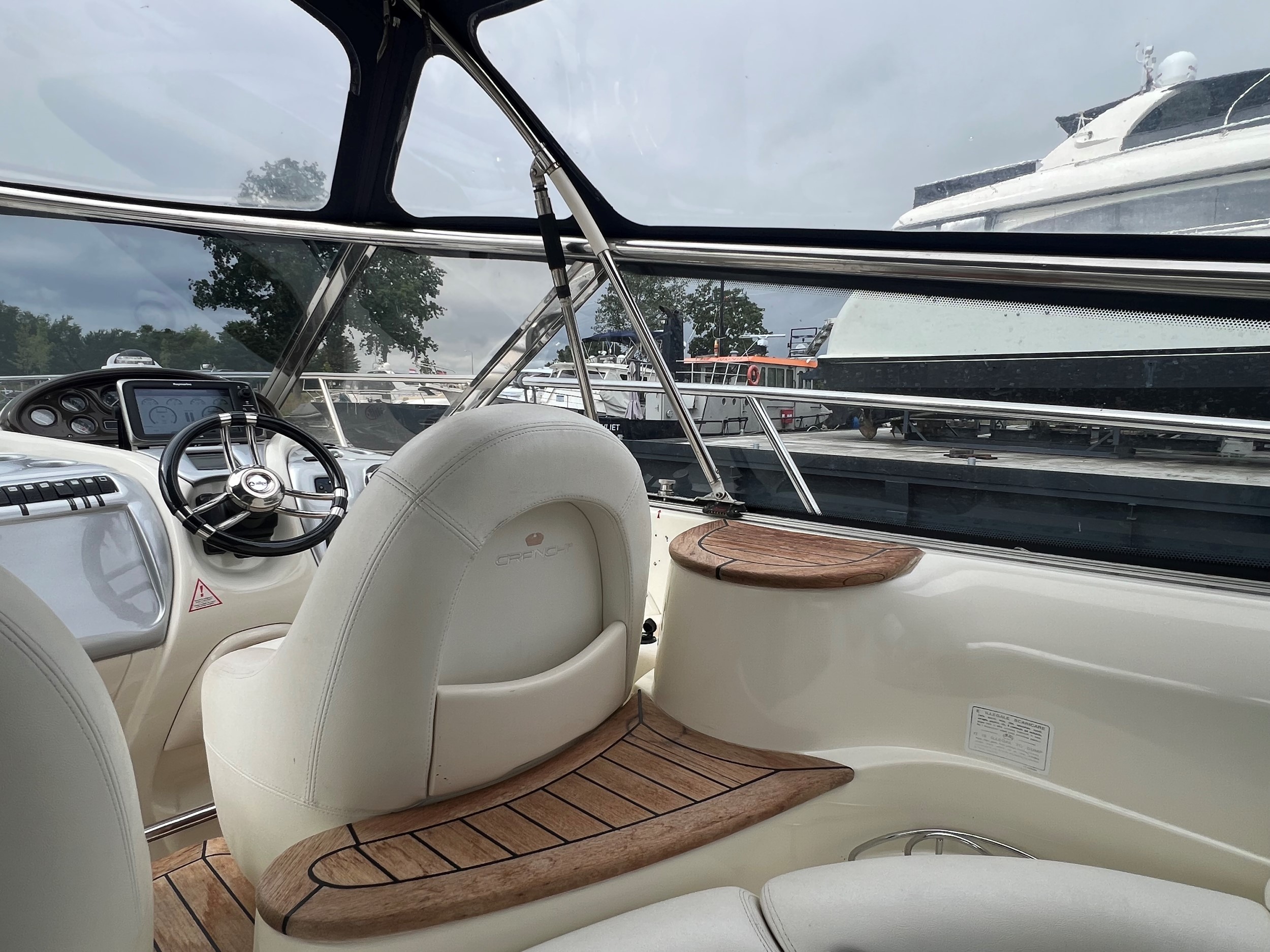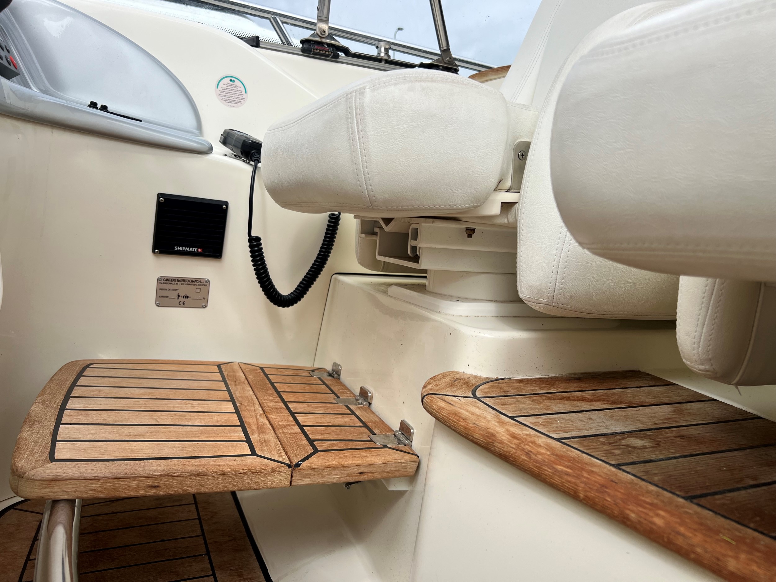 Denne Cranchi Mediterranée 50 er udstyret med: en fuldt lukket kaleche omkring det åbne cockpit, et cockpitbord, en lukket agterdør til badeplatformen, to separate pilotstole og en to-personers co-pilotsæde på bagbord side, i cockpitet er der wetbar med vask/grill/og køleskab.
