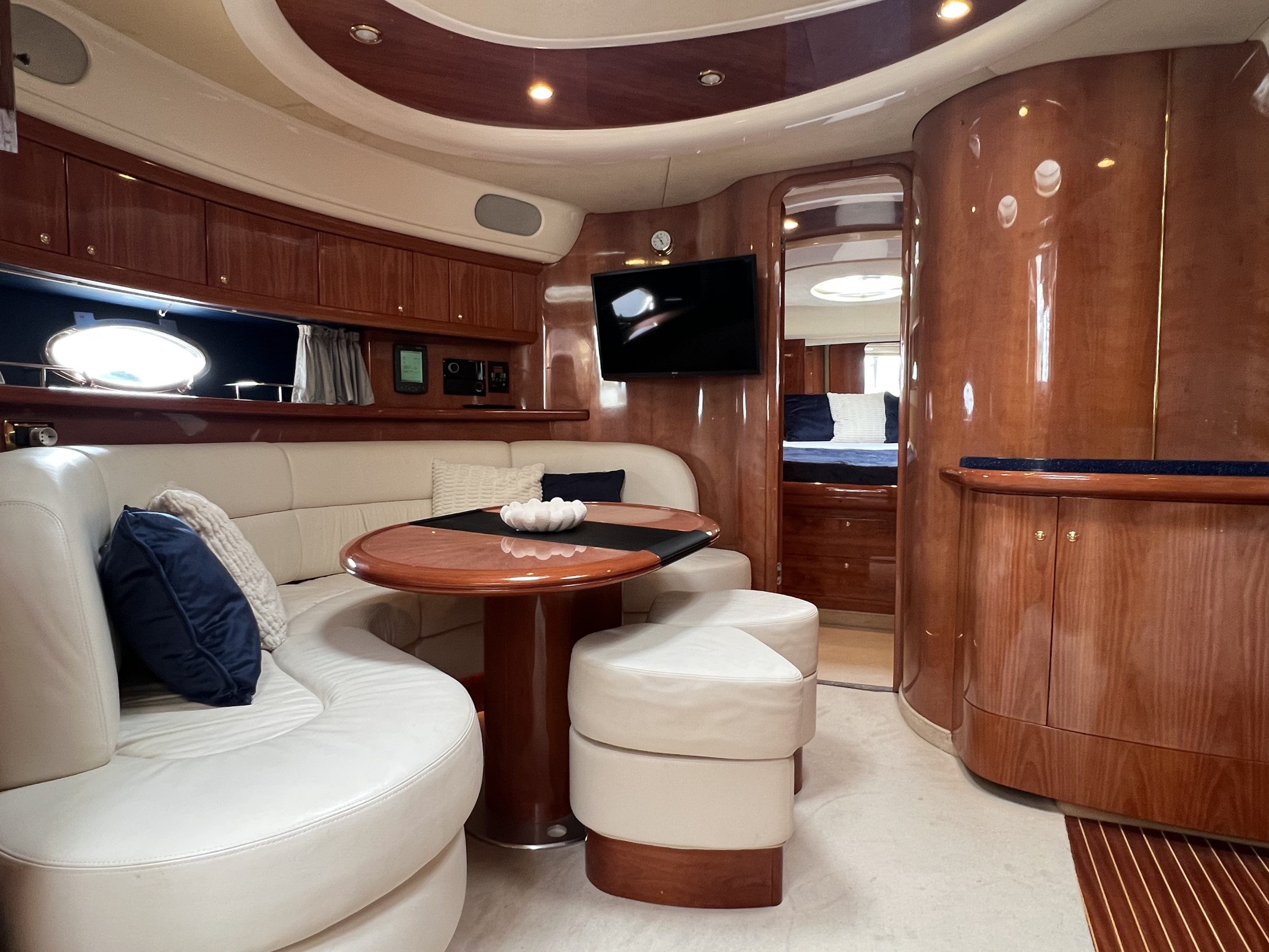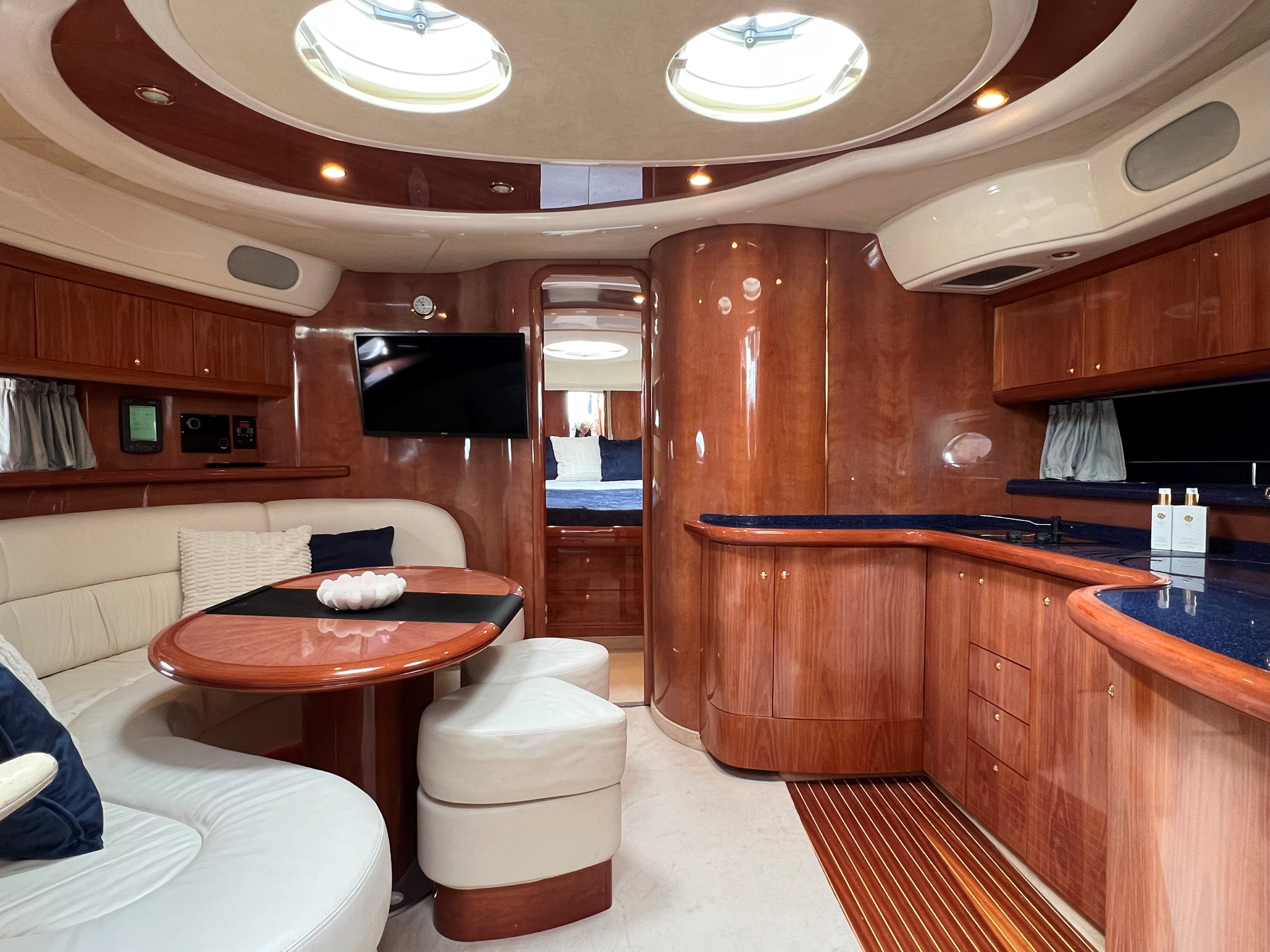 Via en trappe med solide trin bevæger man sig ned i salonnen, hvor en stor U-formet sofa med spisebord skaber et hyggeligt opholdsrum. Her findes også et funktionelt pantry/køkken.
