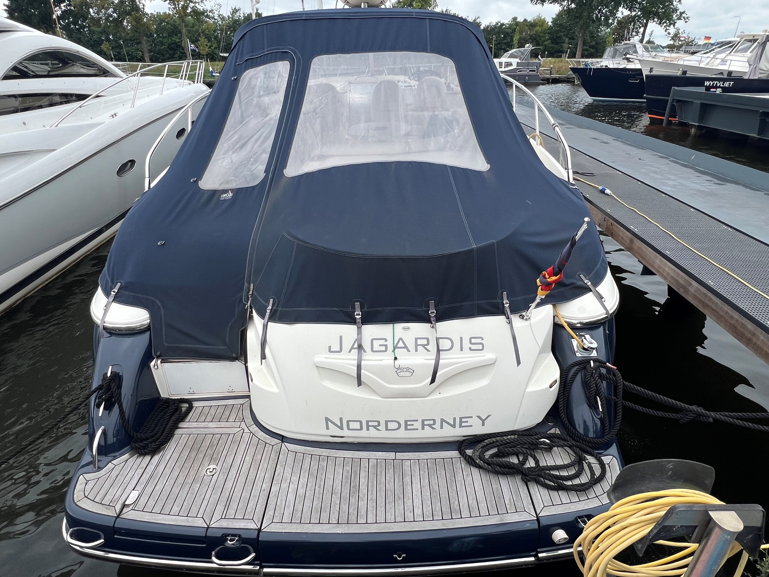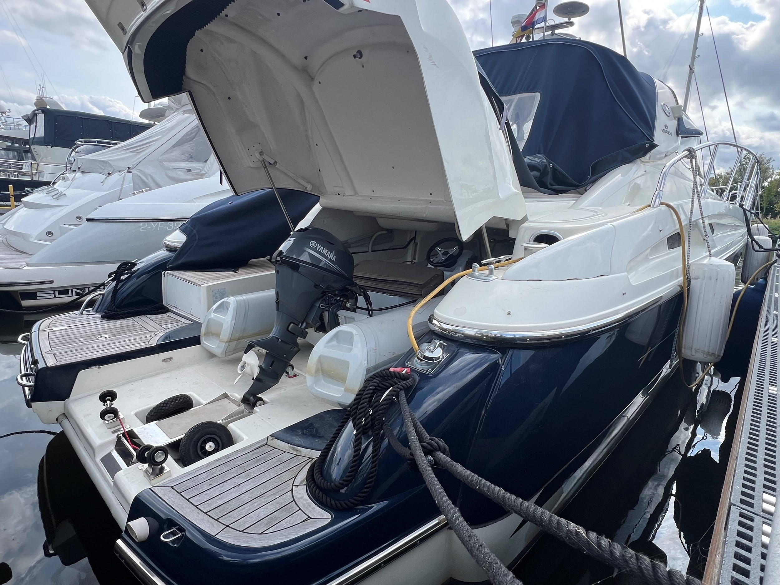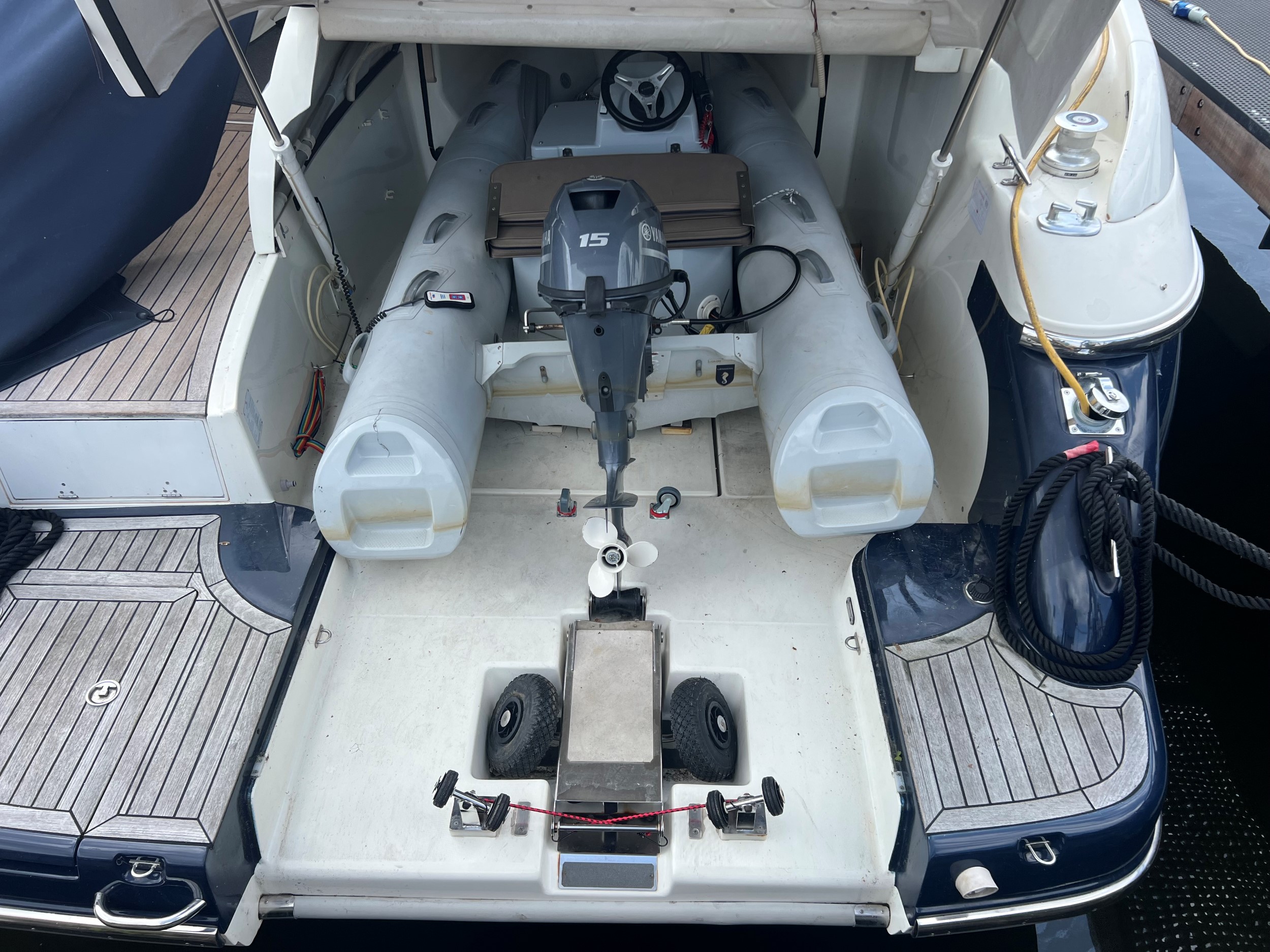 Der er fenderholdere i rustfrit stål, jollegarage med elektrisk spil (jolle medfølger ikke), trin til styrbord sidedæk, , cockpitbelysning, Yachtcontroller-fjernbetjening til betjening af bov- og hækpropeller og begge hovedmotorer gør fortøjning let, Webasto dieselvarme i hele skibet + åbent cockpit, fortøjningsspil på bagbord og styrbord side på agterdækket, solseng på agterdækket med aftagelige hynder, hydraulisk sammenklappelig landgangsbro.