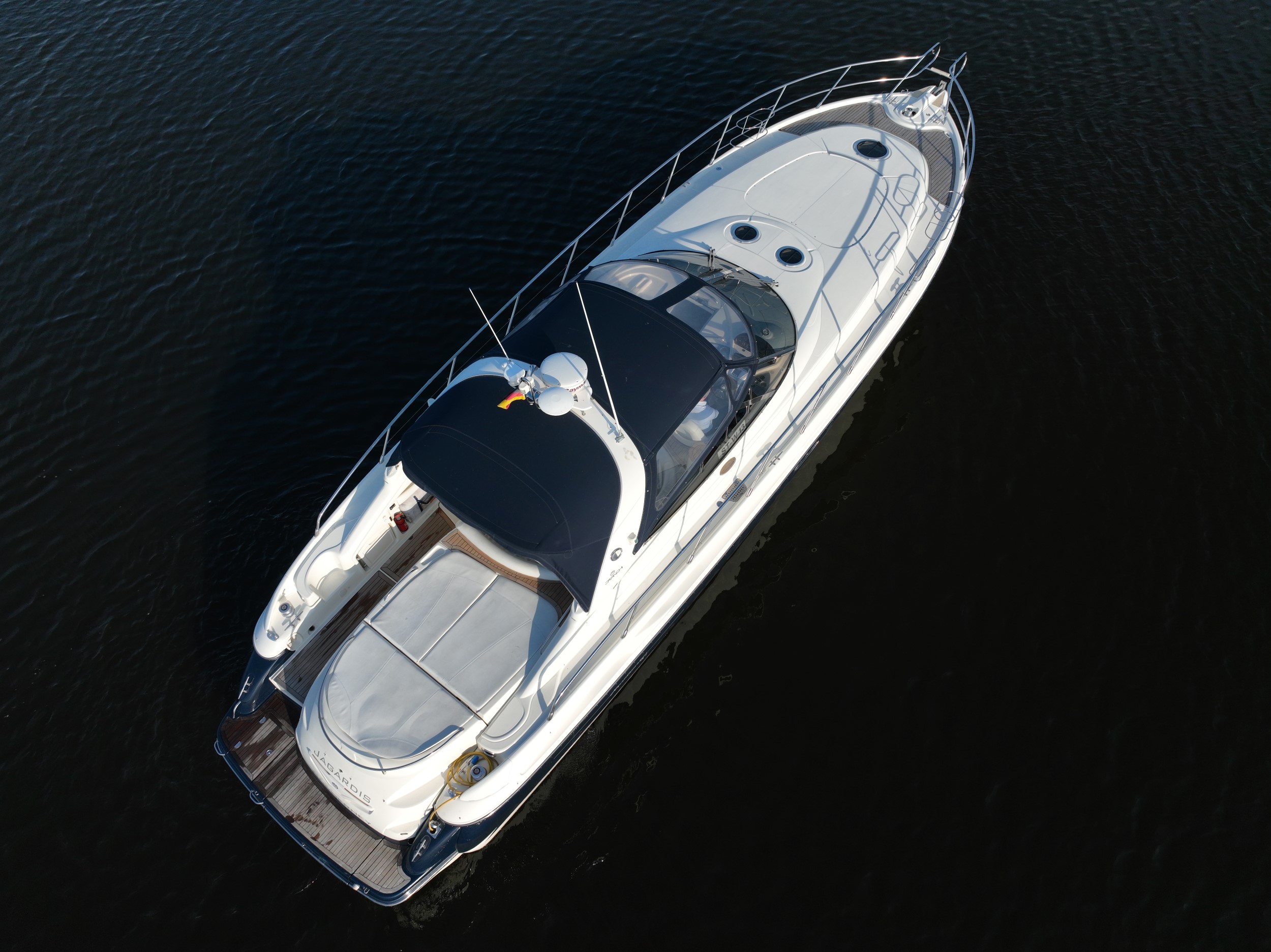 Cranchi Mediterranée 50 er en sand sporty allrounder, der kombinerer praktisk plads med gode sejlegenskaber. Båden er drevet af to 480 hk Volvo Penta-motorer med propelaksler.