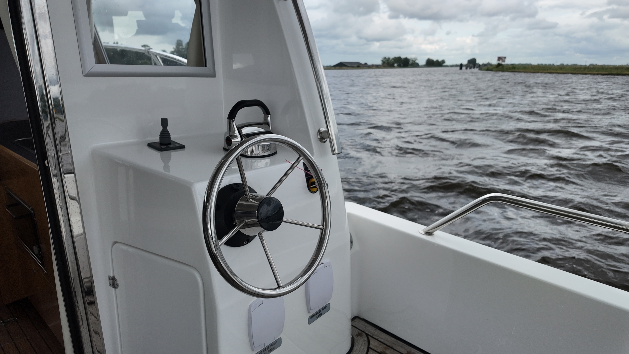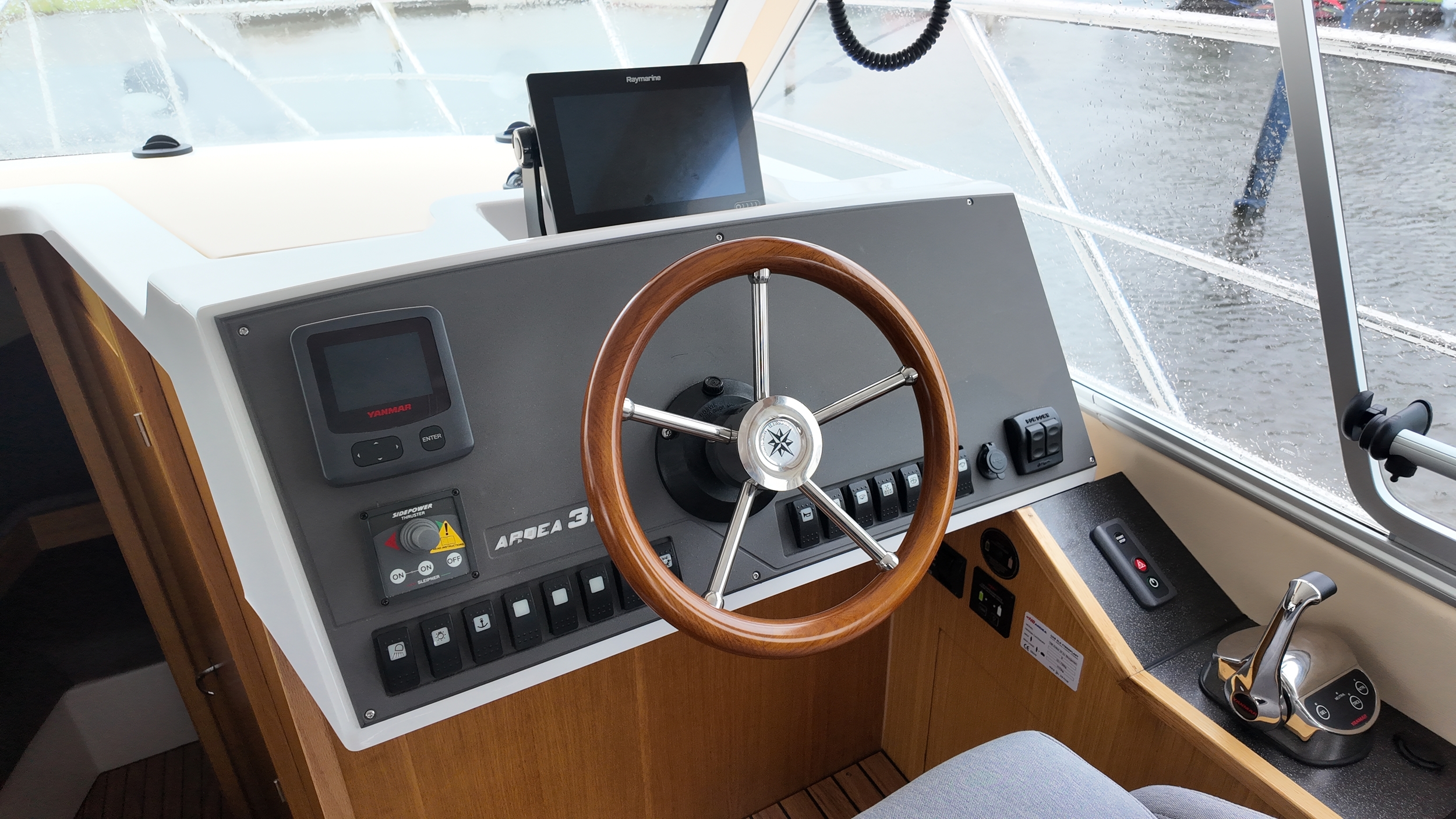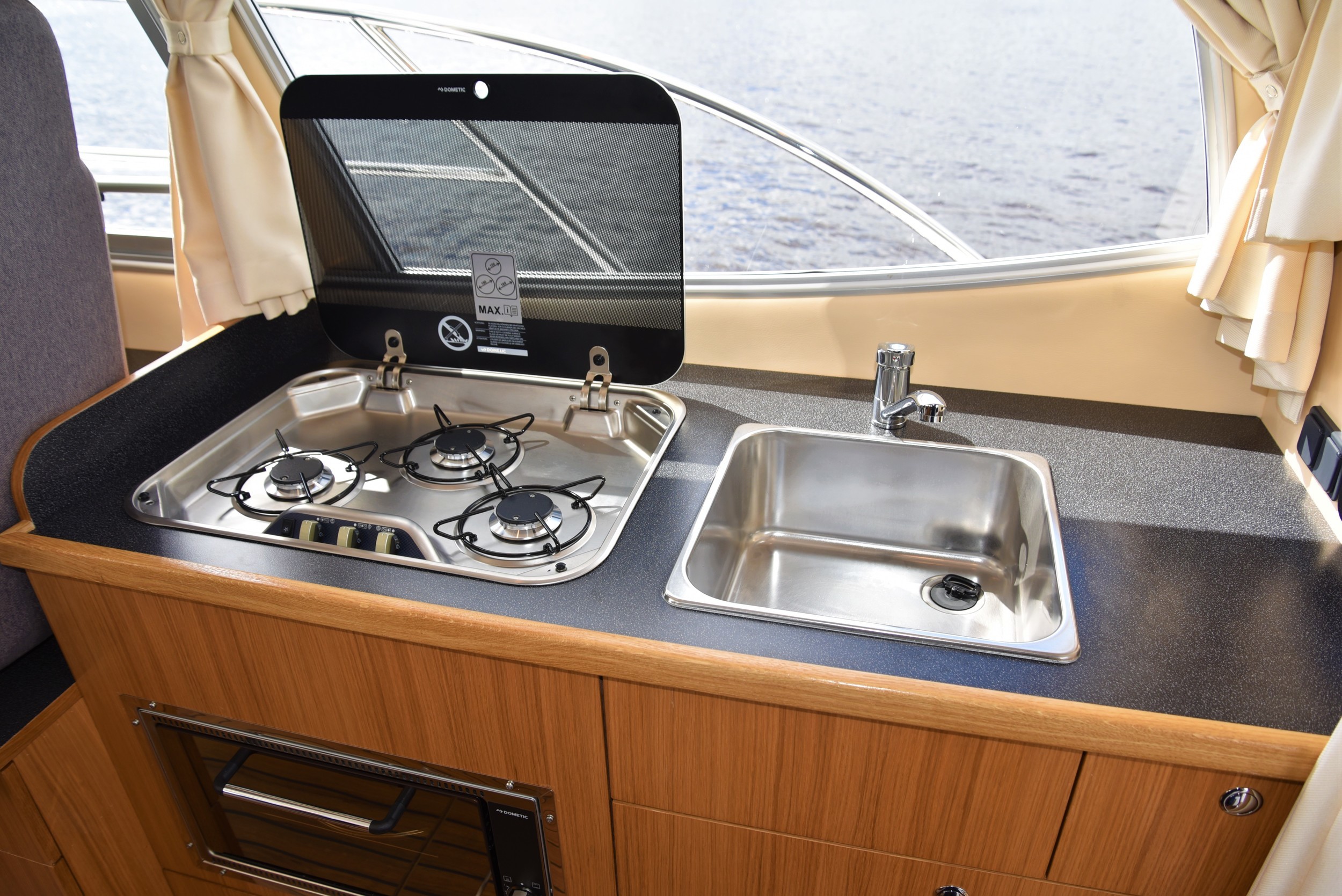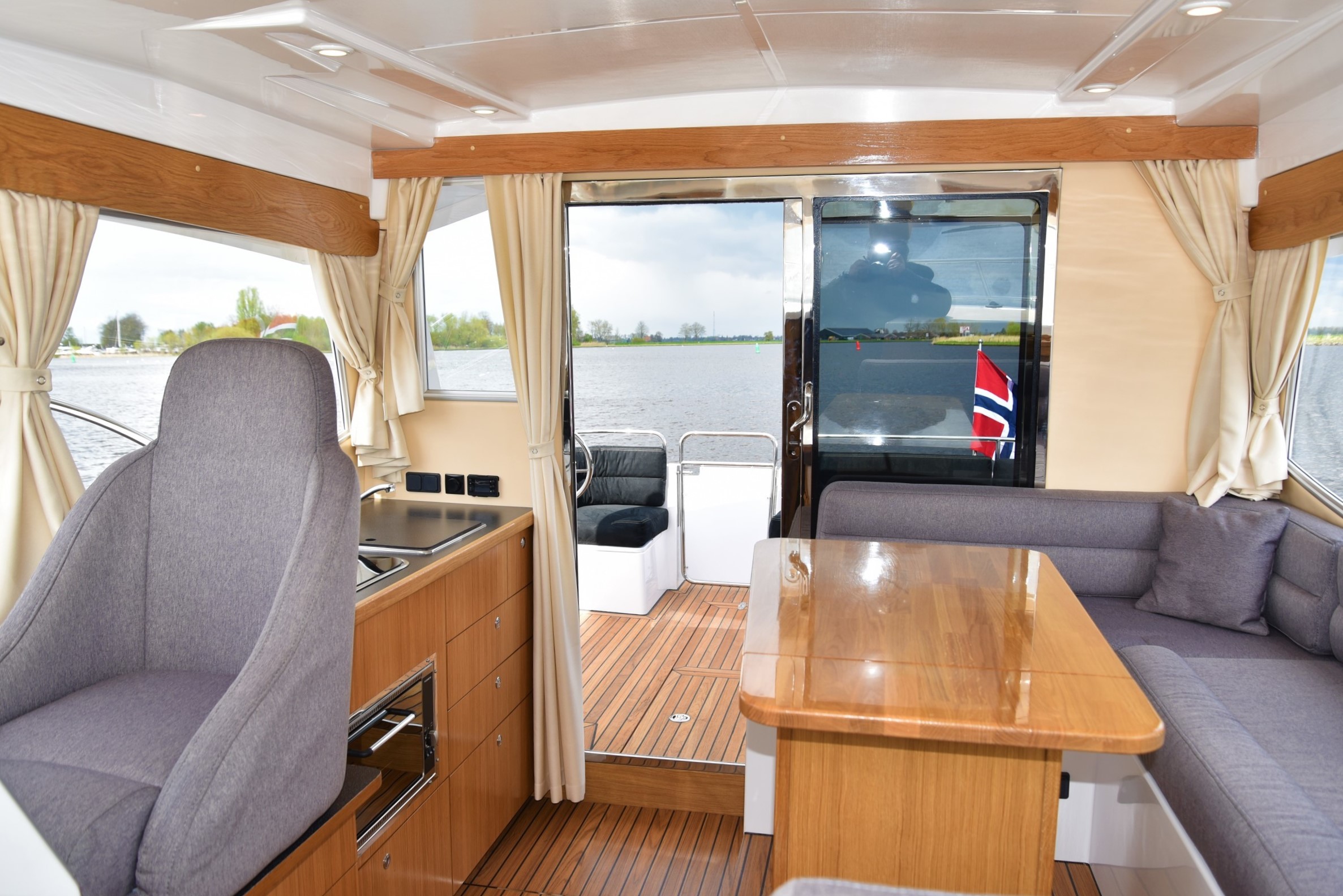 Et meget rummeligt åbent cockpit med rigelig opbevaringsplads under gulvet. En L-formet sofa. Ekstra tyreplads og en vask i rustfrit stål. Tunge skydedøre i rustfrit stål med matchende beslag inviterer dig ind i salonen, som har det alsidige kabys og styreplads på styrbord side.