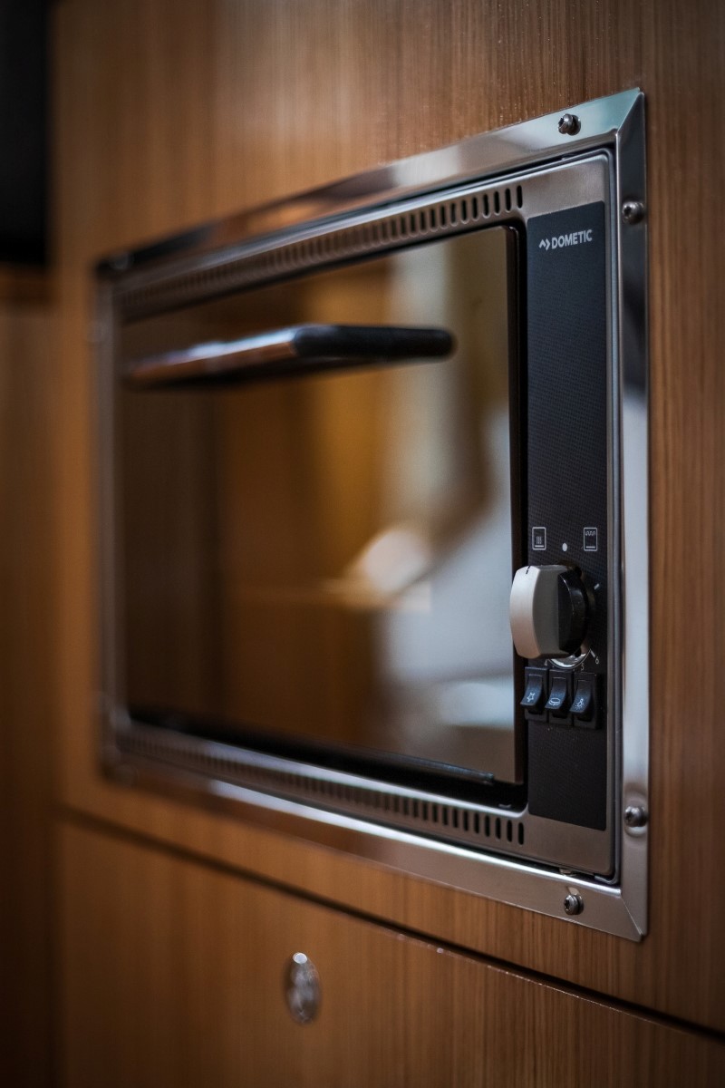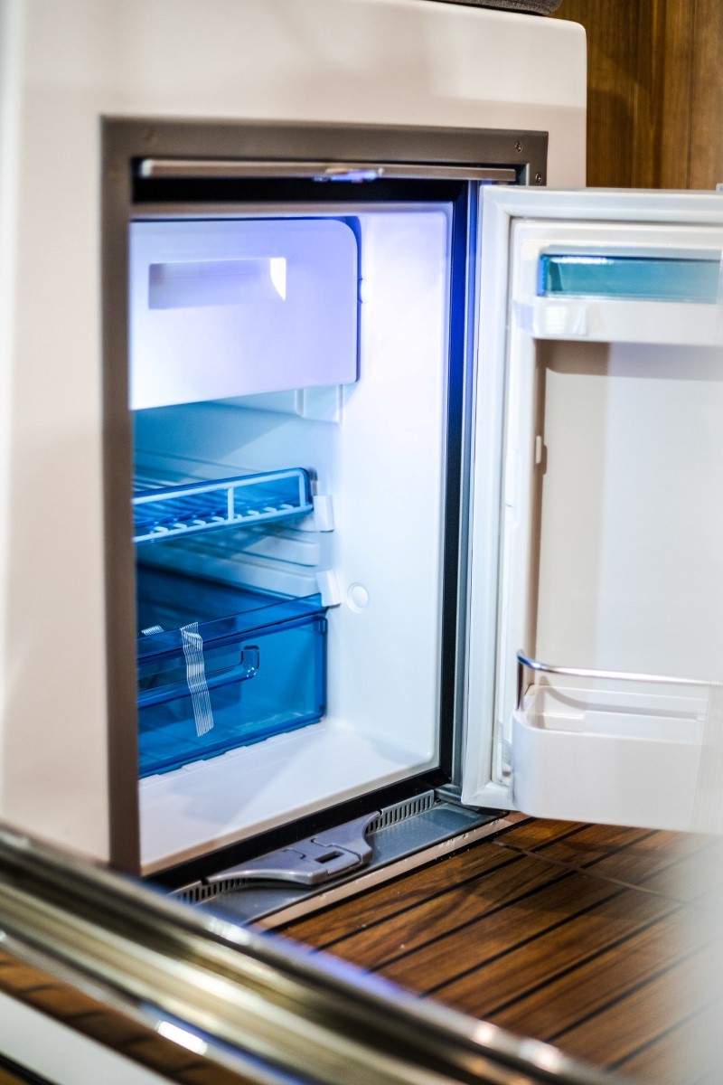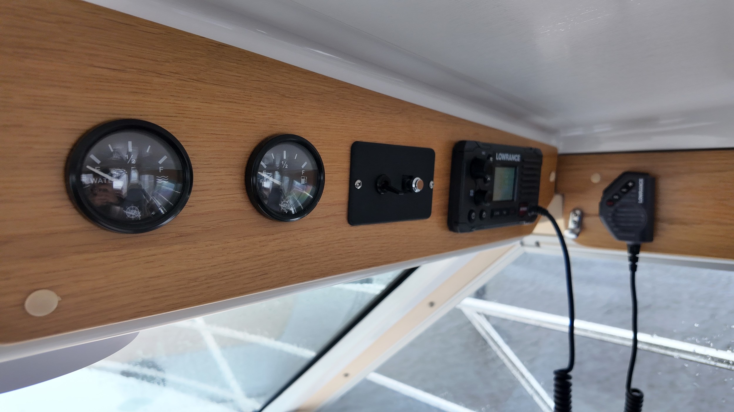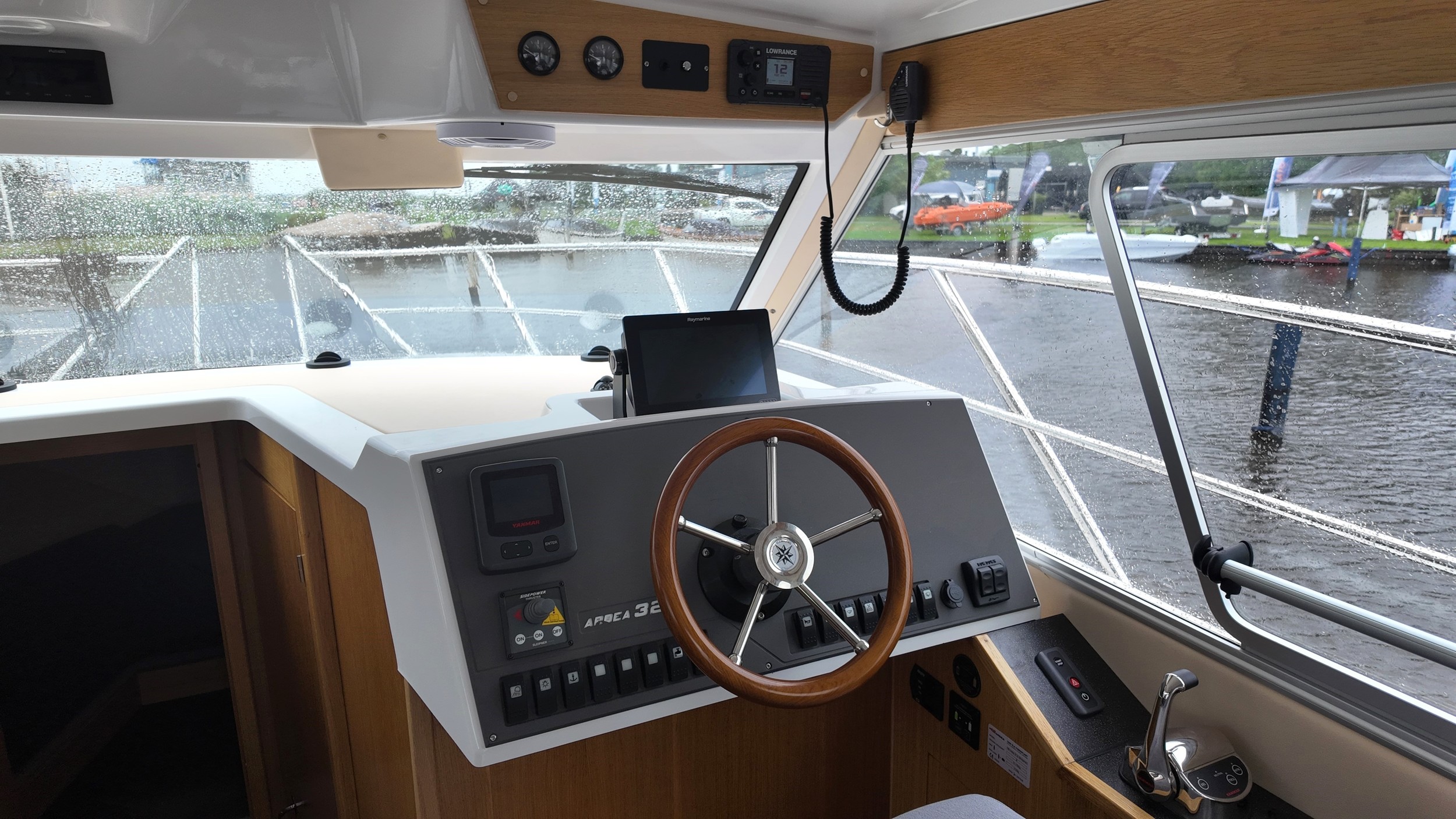 Et meget rummeligt åbent cockpit med rigelig opbevaringsplads under gulvet. En L-formet sofa. Ekstra tyreplads og en vask i rustfrit stål. Tunge skydedøre i rustfrit stål med matchende beslag inviterer dig ind i salonen, som har det alsidige kabys og styreplads på styrbord side.
