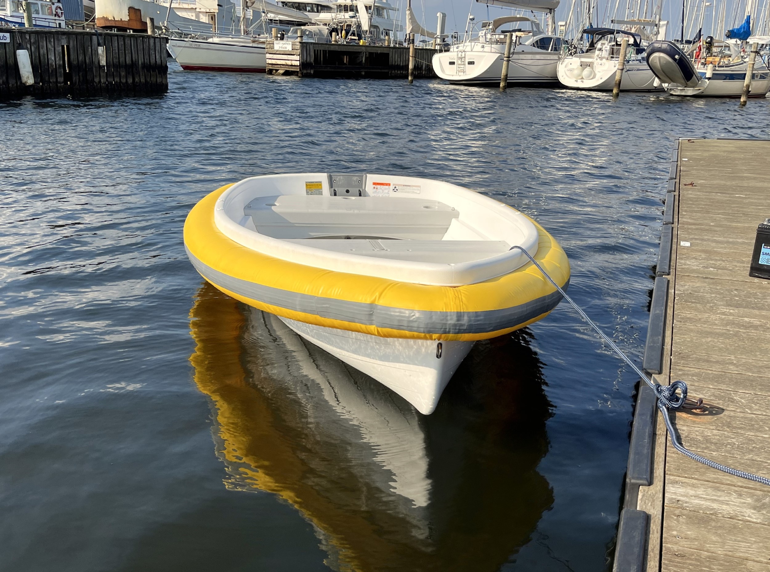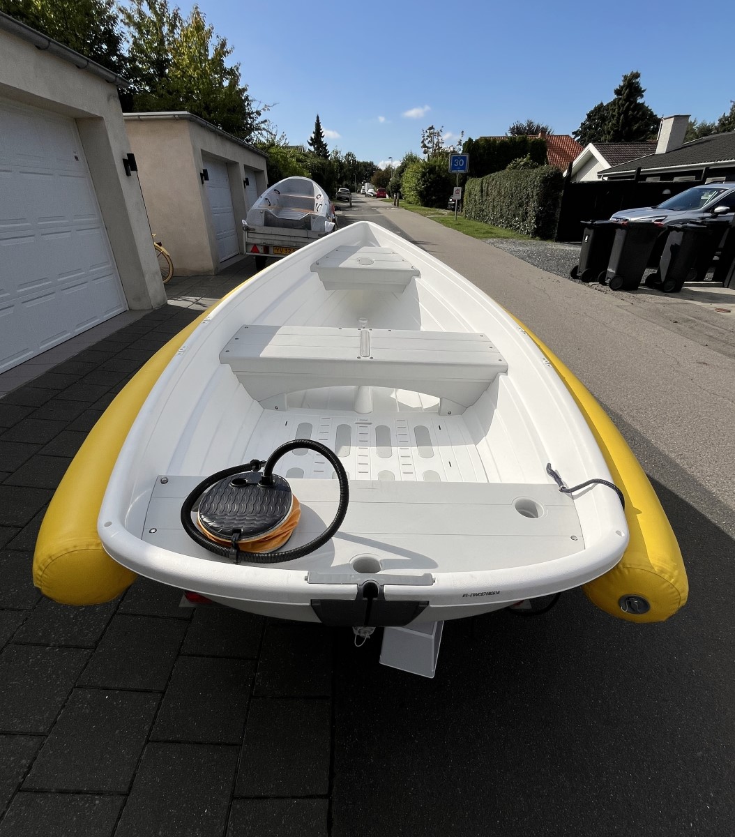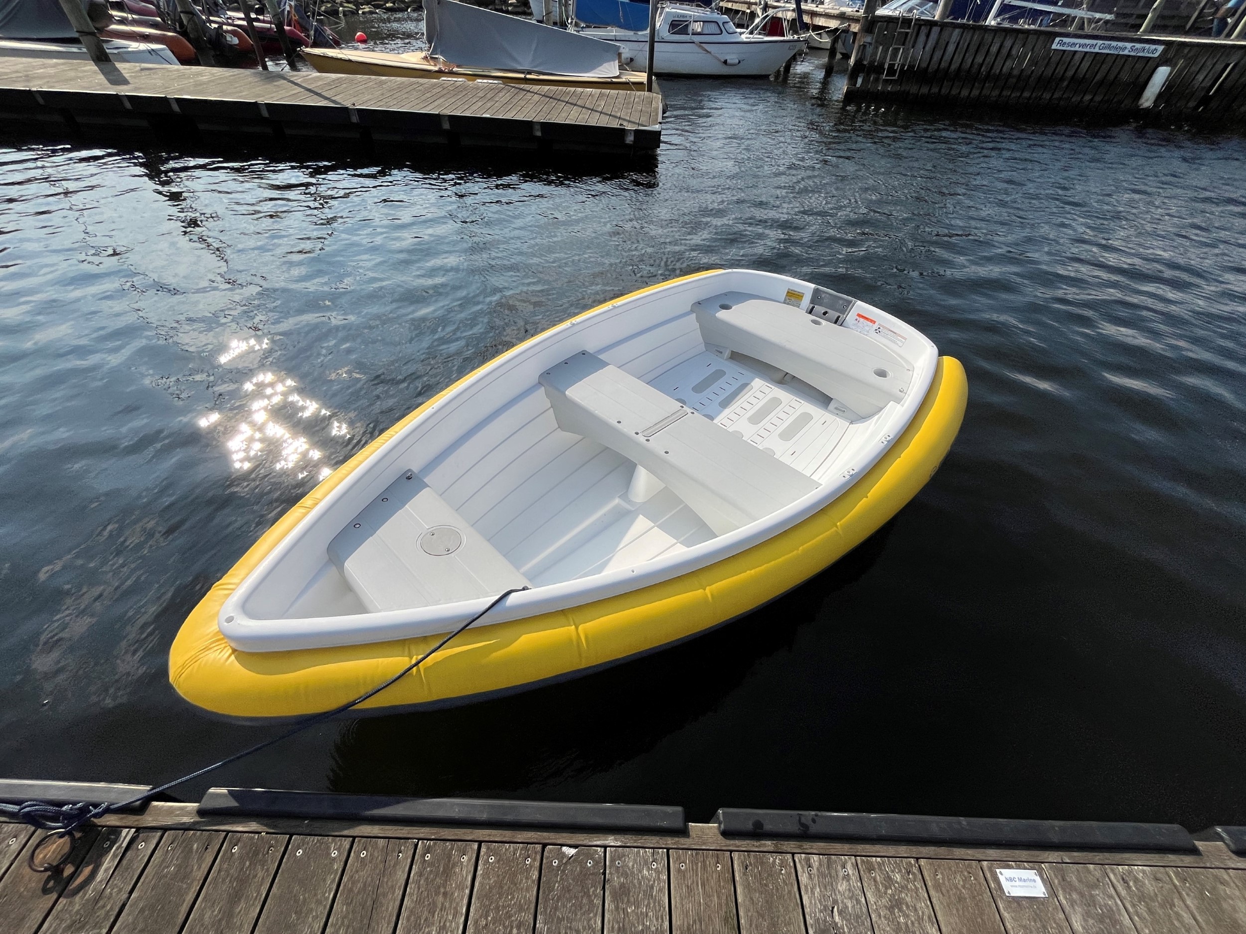 Den er synkefri og udstyret med løfteøjer, så den nemt kan hejses op på en større båd via kran eller gangway – ideel som tender eller til korte ture langs kysten.