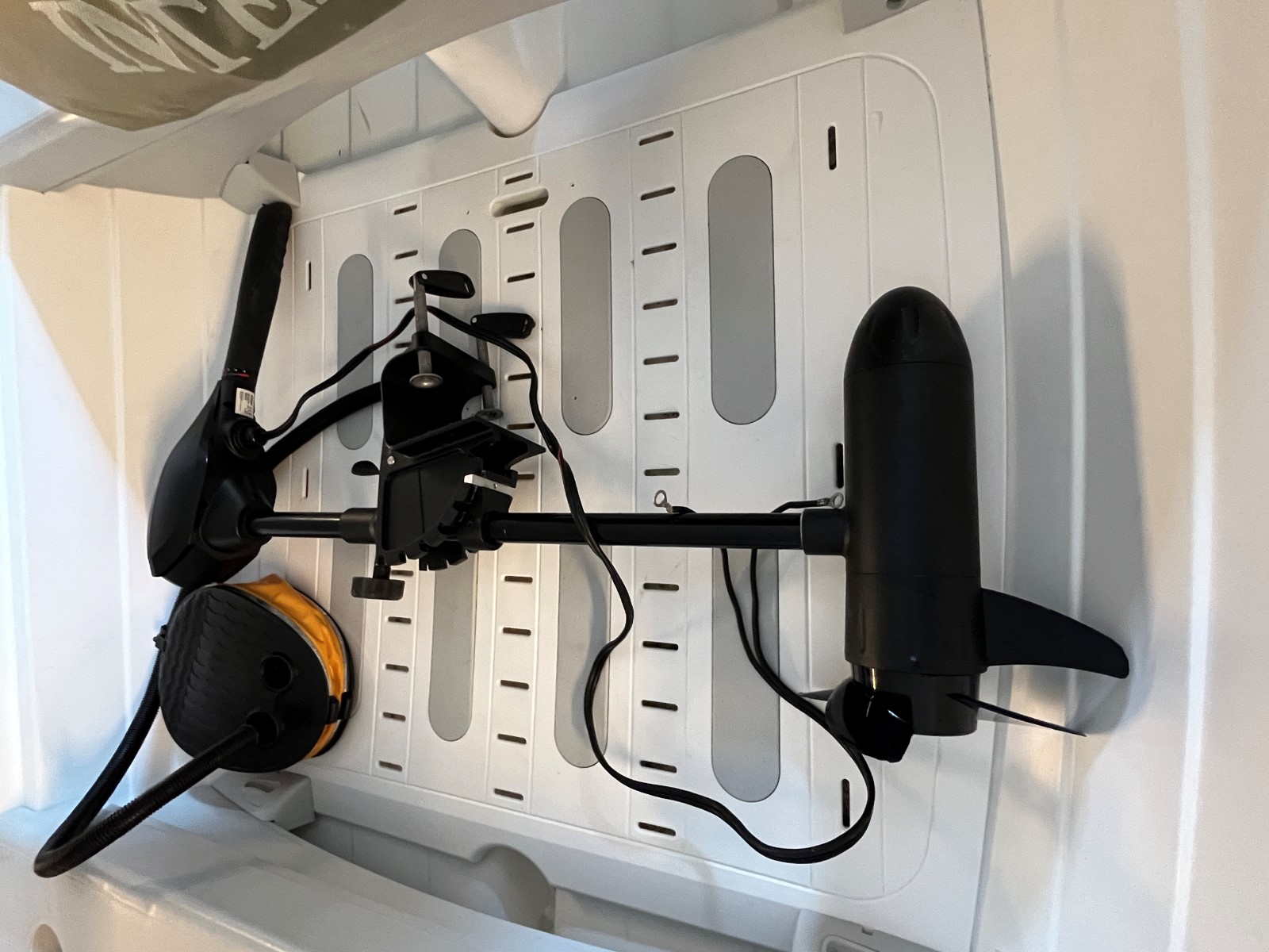 Inkluderet i prisen er også en 54 IPS elektrisk lydløs påhængsmotor, som ligesom båden kun er brugt meget lidt. Motoren er støjsvag, driftssikker og perfekt til rolige og miljøvenlige sejlture. Det eneste du skal købe er et batteri.